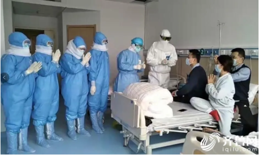 元宵節(jié)當(dāng)天,山東援助湖北醫(yī)療隊第一批隊長賈新華和其他醫(yī)護(hù)人員查房,并將即將出院的消息告訴一家三口。